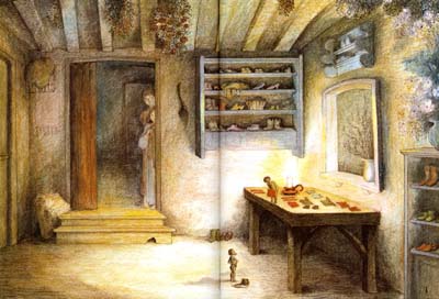 最後の革を裁って眠りについた貧しい靴屋の夫婦は、翌朝、仕事場を見て驚きました。 冬の定番絵本。