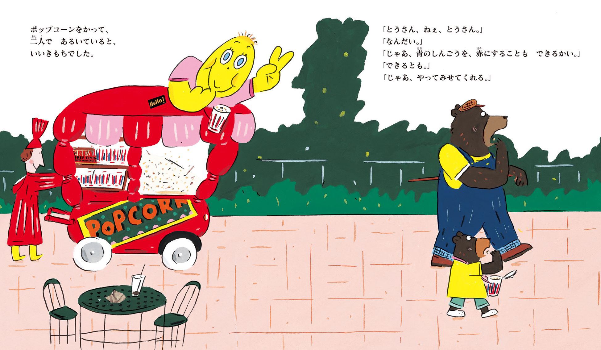 くまの親子が、まちへポップコーンを買いにいきました。 道路の横断歩道のところまでくると、信号は、赤。車がどんどんとおっていきます。 くまのとうさんは、ころあいを見はからって手にしていたステッキをふりあげ、信号をさして「えいっ。」といいます。 すると、どうでしょう! 信号が青にかわったのです。 くまの子は心のなかで感心しました。 (ふうん。うちのとうさん、すごいんだ。「えいっ。」ていえば、しんごう、かわっちゃうんだものな。)