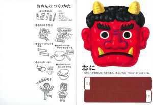絵本「おめんです」に出てくるおめんと同じおめんが作れるキットが入っています。怖いものがなかった息子が節分で鬼のお面を見て泣いていたのですが、この絵本に出てくる鬼は怖がらずによく見てくれました。同じような顔をしてるのになぜと思いながら、これで作った鬼のお面なら節分も平気かな?と読んでいました。 (☆うさこ☆さん 30代・ママ 男の子1歳)