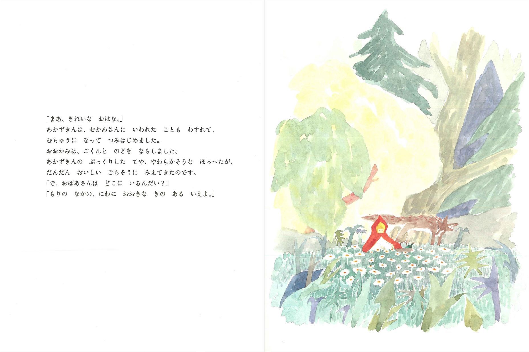 あかずきんはおつかいの途中、森の奥でおおかみとであい、たくみな言葉に誘われて道草をしてしまいます…。世界でもっとも親しまれる童話のひとつ、静かな気配をはらんだ新しい形のあかずきんをお届けします。