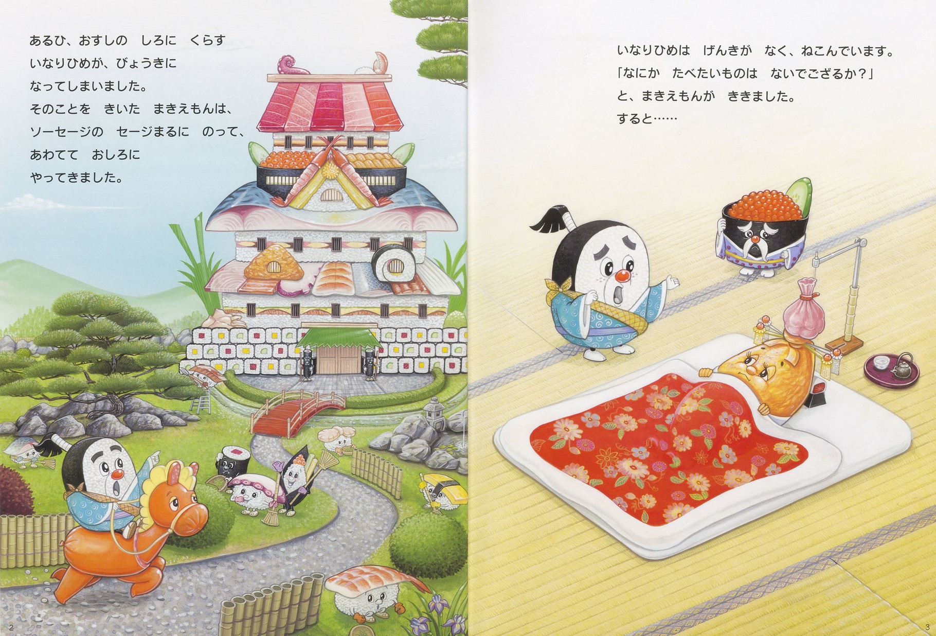 ある日、おすしの城に住む「いなりひめ」が病気になってしまいました。まきえもんは、いなりひめが食べたいと言っている、にっぽん全国のおいしい食べものを探す旅に出発しました。47都道府県をめぐり、郷土料理やご当地グルメ、お土産などを探していきます。