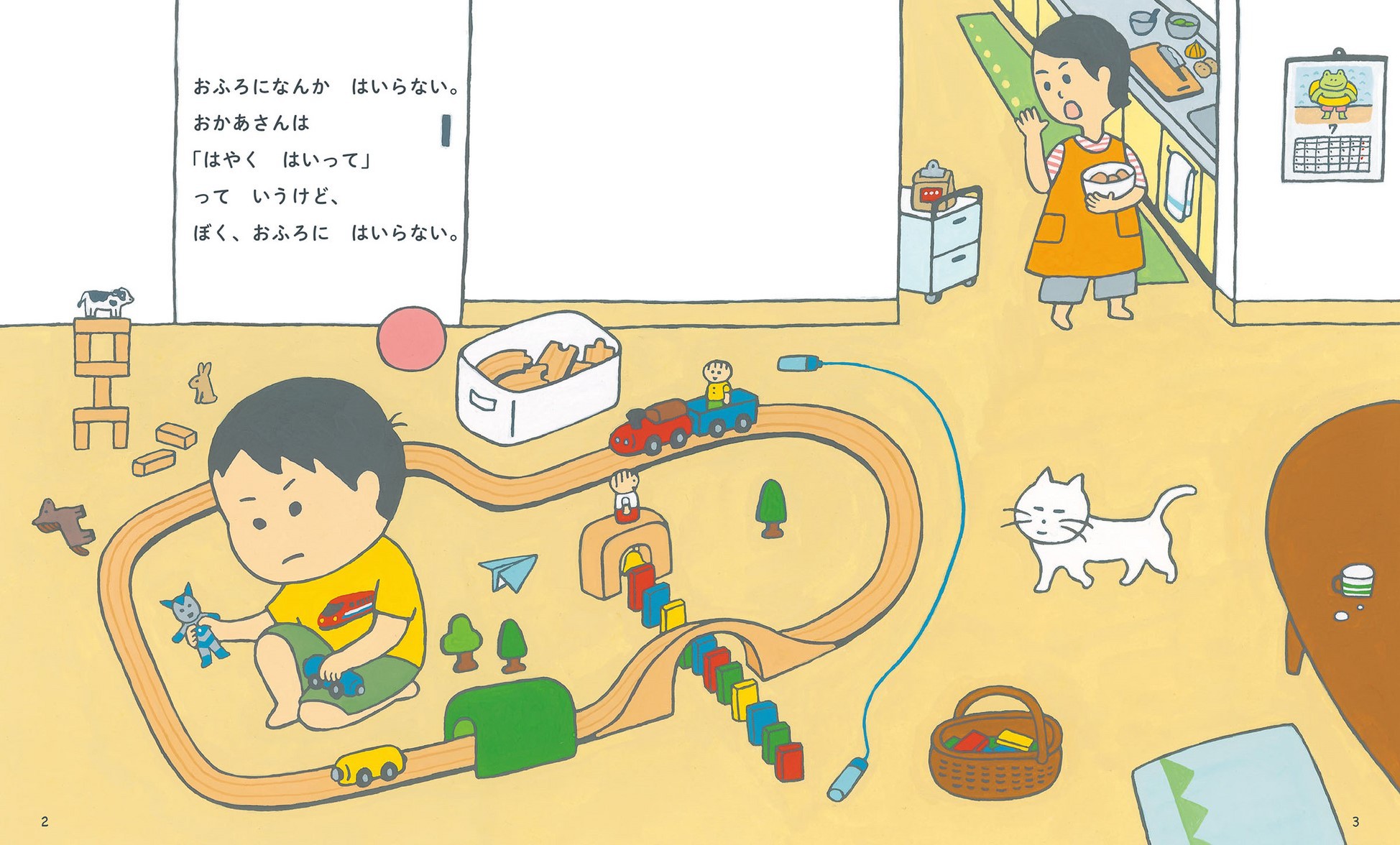 お風呂嫌いには理由がいくつもあるようです。めんどくさかったり遊びを中断したくなかったり。ましてや一人で入れる年頃と周りに思われてからの、自発的ではない入浴は苦行そのもの。本作の主人公、ぼくもまた…なのですが、湯船に現れた、思いもよらないゲストとの、驚くようなけれど心おどる交流体験が、ぼくをほぐしていきます。心身ともにカチコチかたまりそうな時、「ぼくんちのおふろ」に浸かってゆるゆるさせてみませんか。