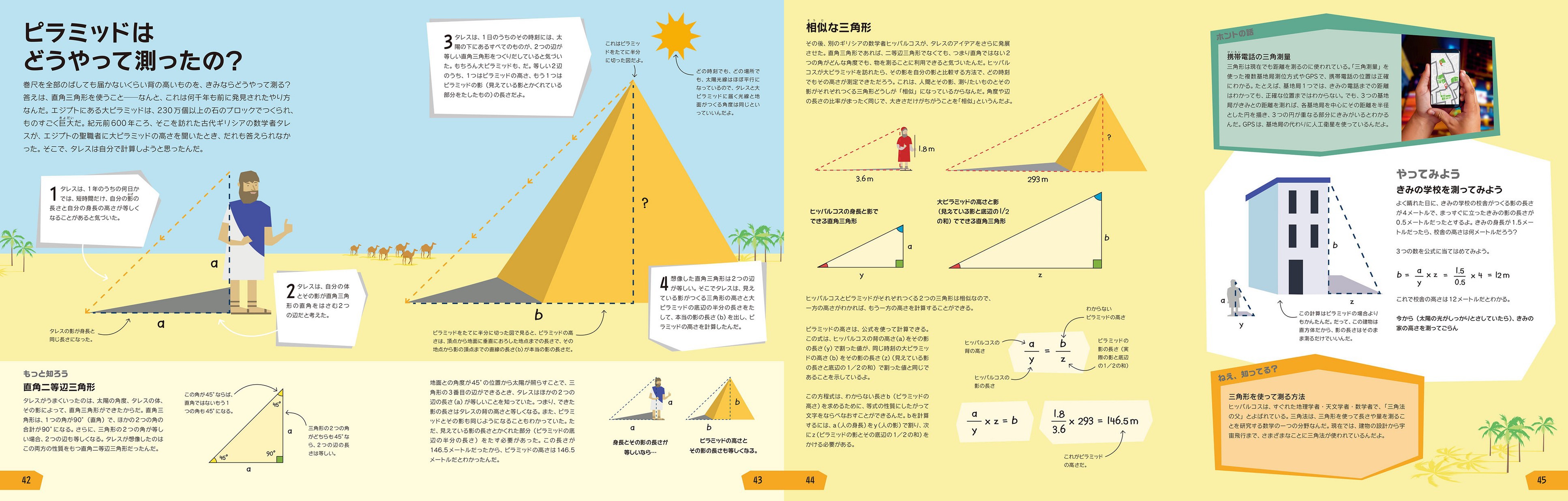 算数や数学に対するきみの考えがすっかり変わるかもしれないよ! きみは気づいていないかもしれないけれど、暗号を解くことからテレビ番組で賞品を当てることまで、そして、彗星の予測から犯罪事件の解決まで、世の中のあらゆることをコントロールしているのは、数学なんだ。 この本では、とっても重要な数学の考えや数学にかかわる発明が「どうやって生まれたのか」を探り出し、「どのように利用するのか」を説明して、ピラミッドの測り方から大金持ちになった方法まで、「どんなことに役立っているのか」を見つけていくよ。