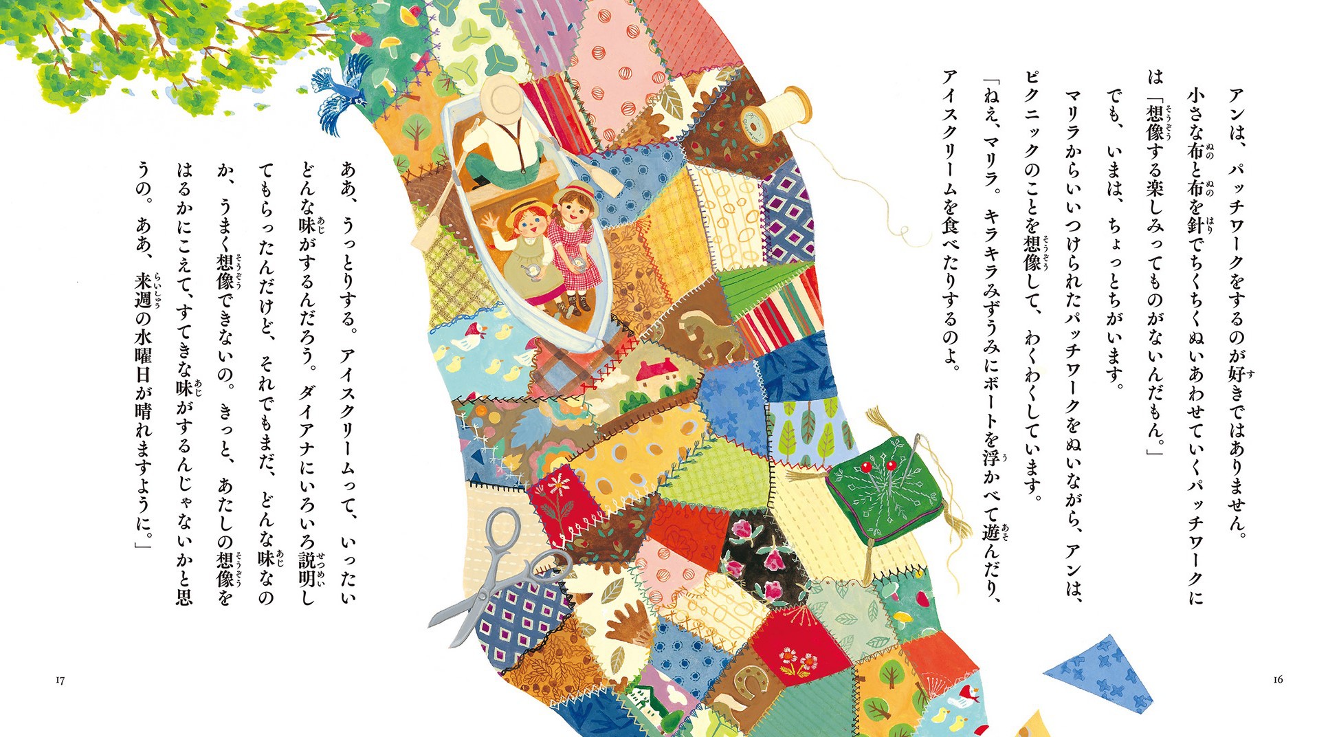 アンの希望や想像力に満ちあふれたことばや、暮らしぶりを生き生きと描くのは、作家の小手鞠るいさん。あっという間にひきこまれる語り口に、オールカラーの挿絵がやさしくかわいらしくて、読み始めたらどんどん読めてしまうはず。挿絵を描かれたのは、さこももみさん。色彩豊かなプリンス・エドワード島の自然の景色のページはずっと眺めていたくなるほど美しく、家の中のインテリアや家具、ピクニックの小物は可愛らしく魅力的です。またアンをはじめとする登場人物の表情も豊かで生き生きとしていて、それぞれの気持ちがしっかりと伝わるとともに、さまざま想像も膨らんでいきそうです。