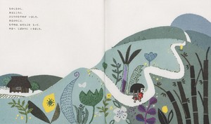 とにかく本書はMICAO(みかお)さんの刺繍と布の絵がすてき! ステッチで輪郭をとられた赤い着物姿の女の子はかわいらしく、鬼たちの姿もユーモラス。鬼の毛やひげ、川、植物など、縫い目をたどってずっと眺めていたくなります。