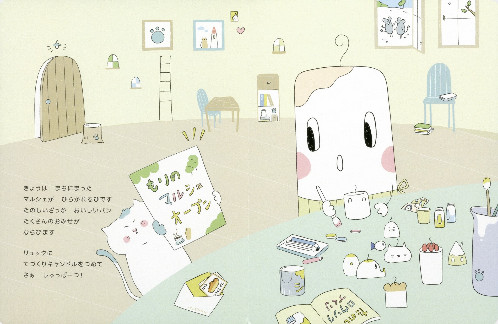 今日は待ちに待ったマルシェが開かれる日。楽しい雑貨、美味しいパンなどたくさんのお店が並びます。 ロウソくんは、手作りキャンドルをリュックに詰めて出発。前回は手作りクッキーをおすそわけでしたが、今回は「これどうぞ」と、この手作りキャンドルを商品と交換するのです。