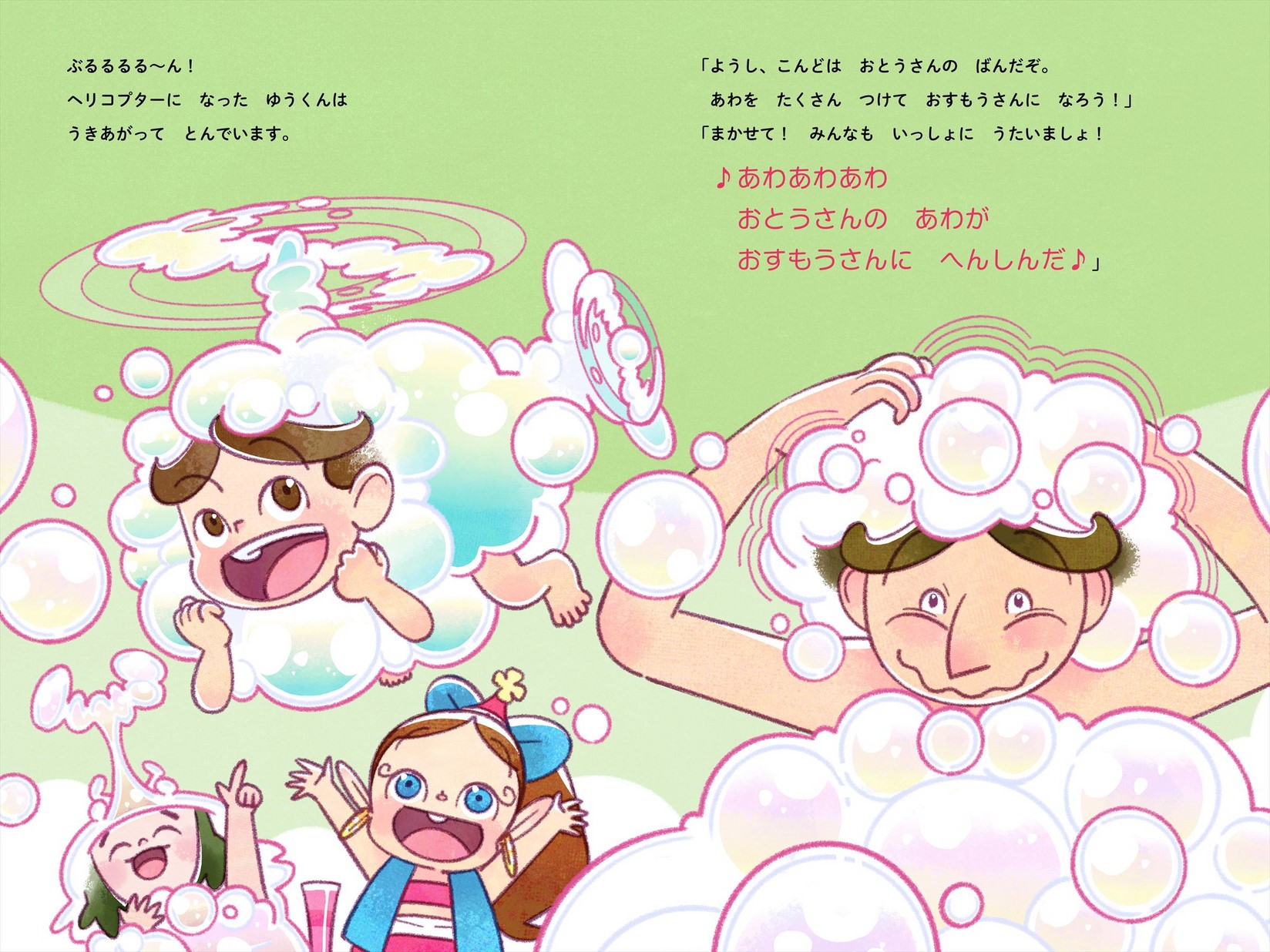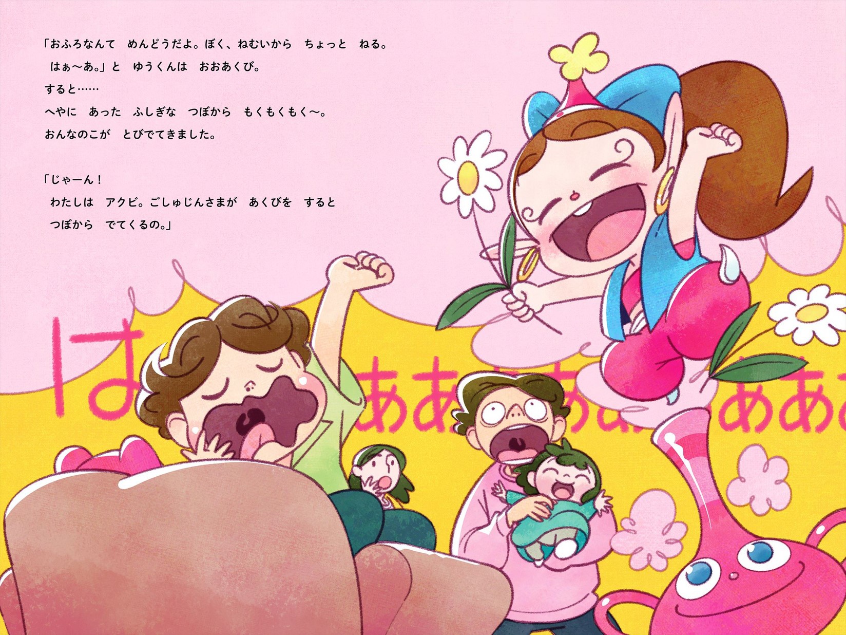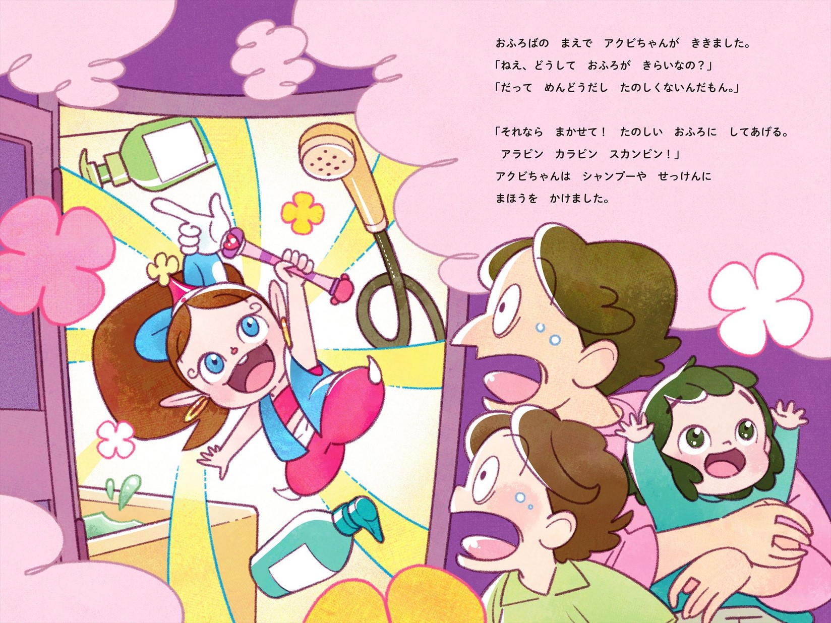 絵本の主人公は、ハクション大魔王の娘「アクビ」。お風呂嫌いのゆうくんが、「お風呂イヤだなぁ〜」と大あくび。すると魔法の壺から「アクビ」が現れます。「アクビ」の魔法にかかったシャンプーやせっけんの泡で、お風呂タイムに楽しく大変身。「お風呂イヤイヤ」だったゆうくんにも嬉しい変化が……。さらには「アクビ」の弟「プゥータ」も現れて……。