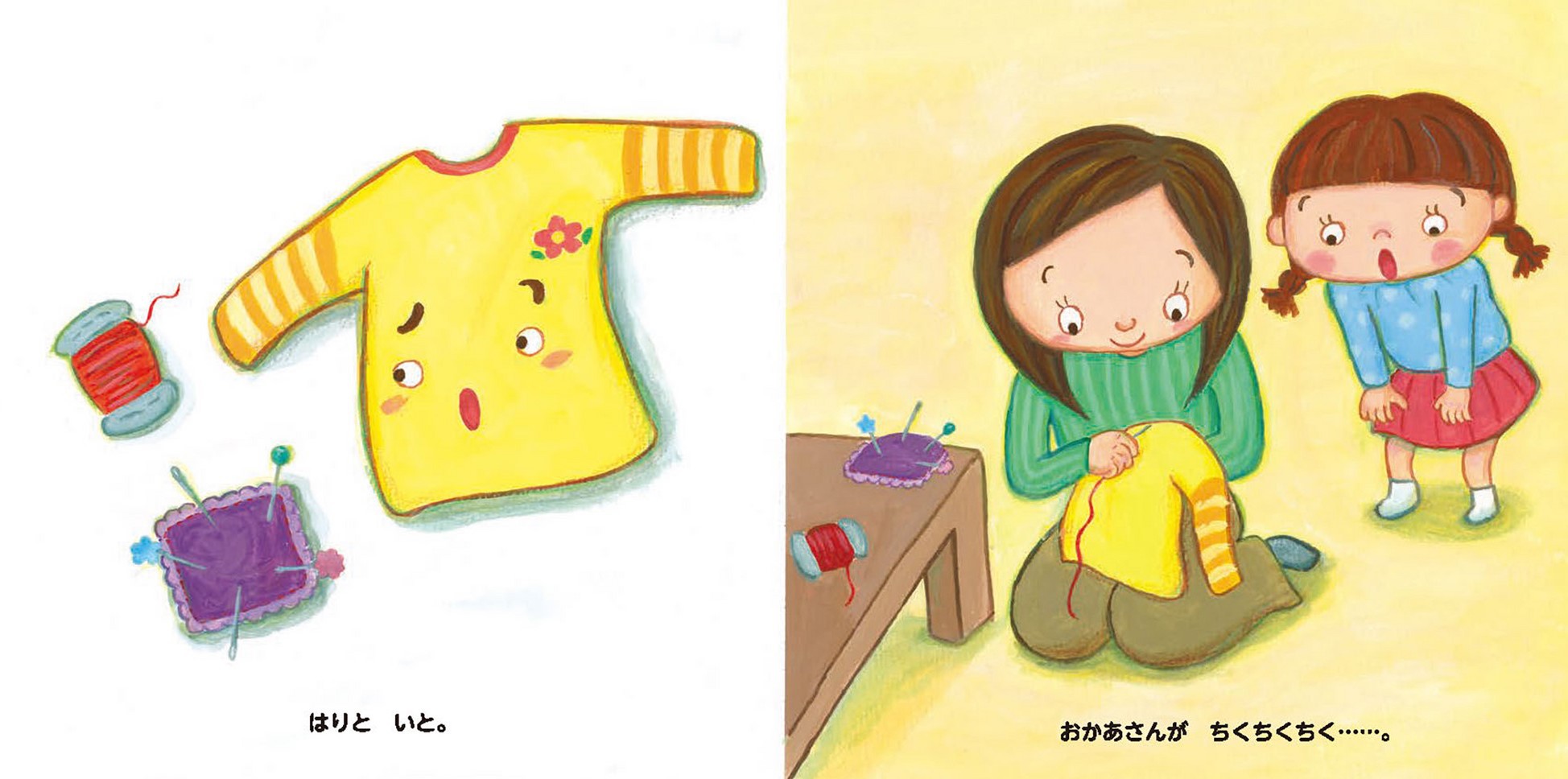 すると針と糸が登場して、お母さんがちくちくちくと魔法をかけると…… お花のワッペンが車のワッペンに変わり、隣に住むゆうくんへのおさがりになりました。