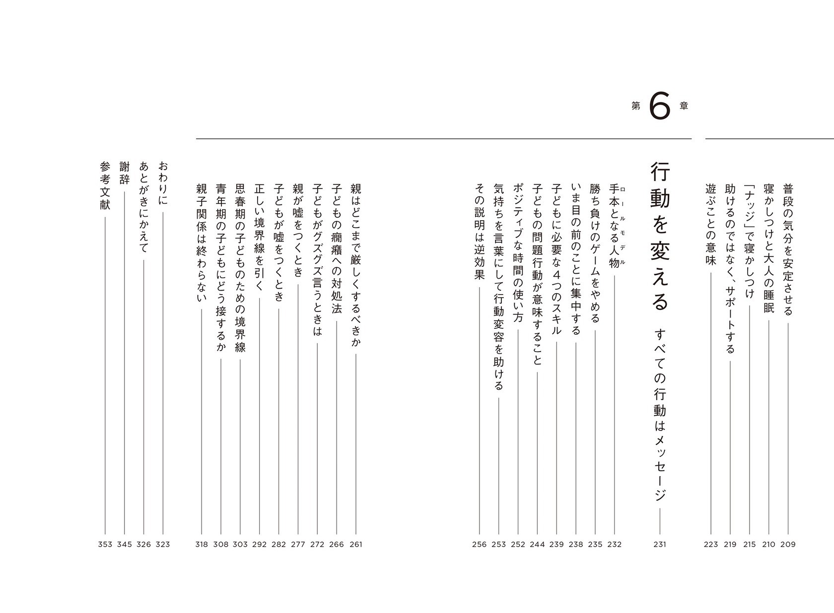 子育ての負の連鎖を断ち切るにはどうすればいいか? 親はどこまで厳しくするべきか? 親子の絆を深めるコミュニケーションの取り方、妊娠・出産期の悩みへの具体的な対処法、子どもの心の健康の育み方、思春期の子どもとの適切な距離感、自走できる子どもになるために必要なスキル、子どもの行動が変わる行動指針など、実践的なアドバイスを満載。