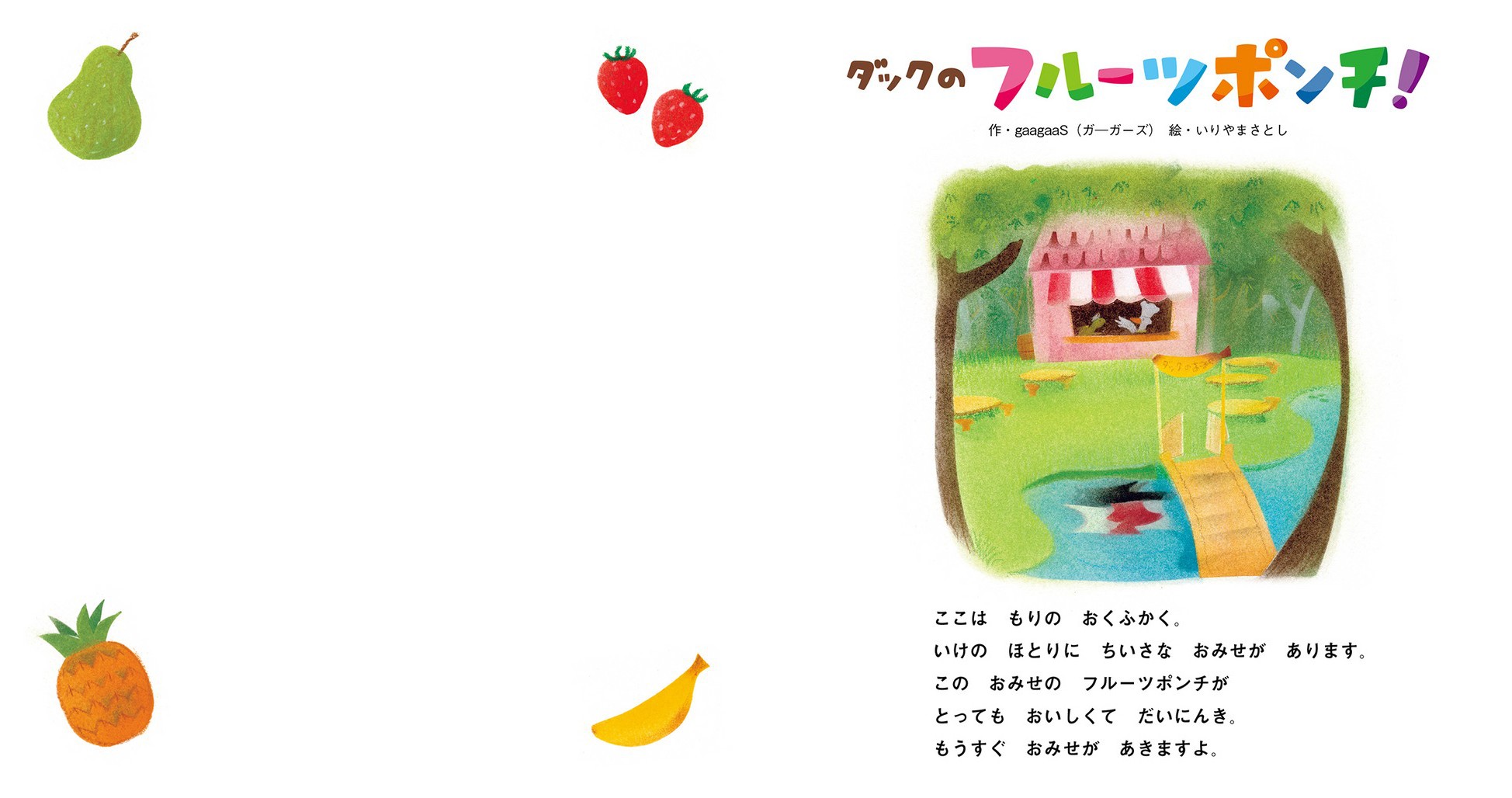 ダックが作るしゅわしゅわあま〜いフルーツポンチは、子どもたちが作ってみたくなること間違いなし!保育の現場で活躍中のうたあそびユニットgaagaaSによる初の絵本。人気絵本作家いりやまさとしさんの、かわいらしく、ユーモアのある絵もお楽しみください。