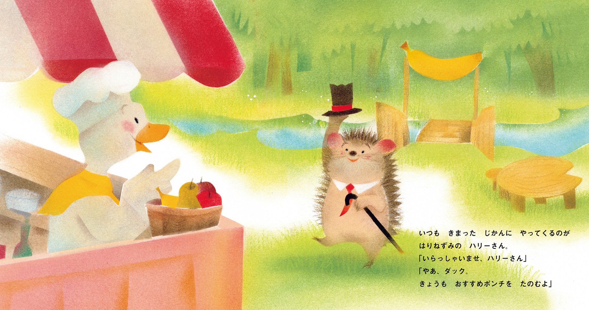 あひるのダックの作るフルーツポンチは、森の動物たちに大人気。いつもやってくるハリネズミのハリーさん、ちょっぴりいじわるなきつねさん、にぎやかなかるがもの親子など、個性豊かなお客たちが次々にやってきます。