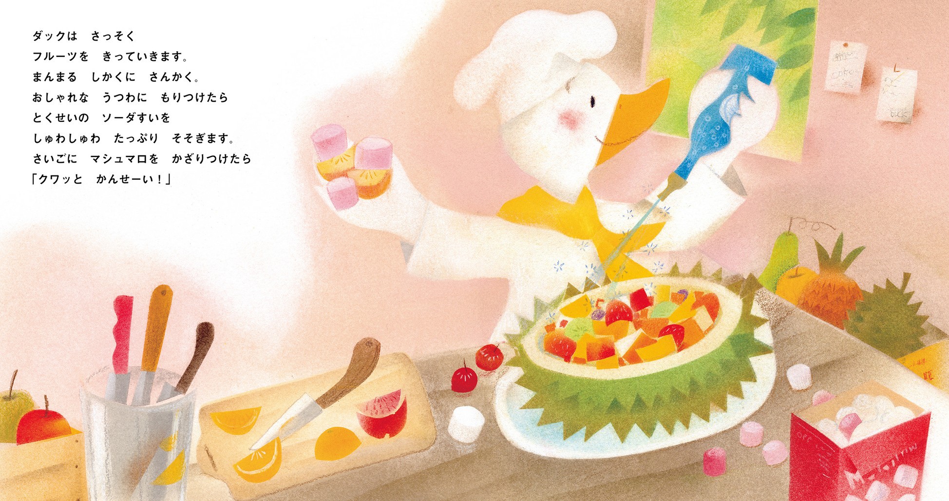 ・あひるのダックとお手伝いのかめいさんが個性豊かなお客たちの注文に答えて、いろんなフルーツポンチを作る。お話が楽しいことはもちろん、子どもたちの「作ってみたい!」「食べてみたい!」を促す。
