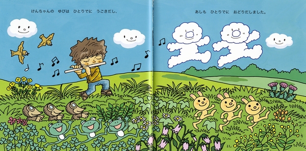 けんちゃんは、木や花が大好きです。野原の中に寝ころぶと、自分と草木はおんなじだ、と思えてくるのです。 ある日、いつものように野原を散歩していると、銀色の笛を拾いました。 けんちゃんが吹いてみると、風が起き、野原全体に響きわたり、動物が踊りだしました。 笛の音が強くなるごとに景色は夏から秋へと変わり、そして、けんちゃんは自然に溶け込んでいきました……。 季節の移ろいを美しい色合いで表現した叙情絵本です。