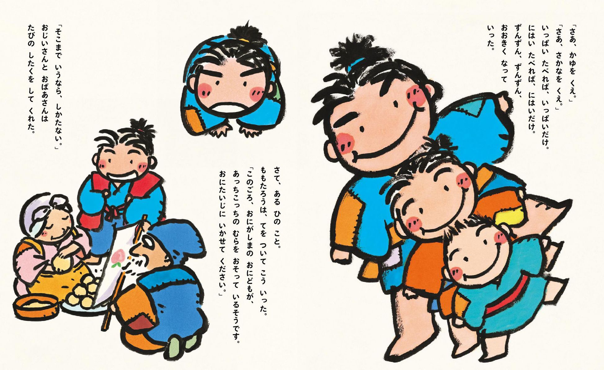 やさしく、強く、大きくなれ! ももから生まれた 元気っ子! 「にっぽんいちの きびだんご。ひとつ たべれば、じゅうにんりきじゃ。」 「ひとつ、ください。おともします。」 ※おはなし もうひとつ「とりのみじいさん」