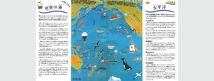 この絵本の特徴は、世界の国や地域が、大陸を取り囲む海や、ひとやモノの移動によって、互いにつながっていることに注目したところにあります。どのページにも、めずらしい野生の生きものたちや、世界遺産になっている歴史的な建てもの、遊びやスポーツなど、子どもたちの興味を誘う、さまざまなイラストがちりばめられています。中国の大規模な洋上風力発電所や、「太平洋ごみベルト」など、21世紀を生きる子どもたちが避けてはとおれないエネルギーや環境問題に、しっかり目を配っているのもポイントです。