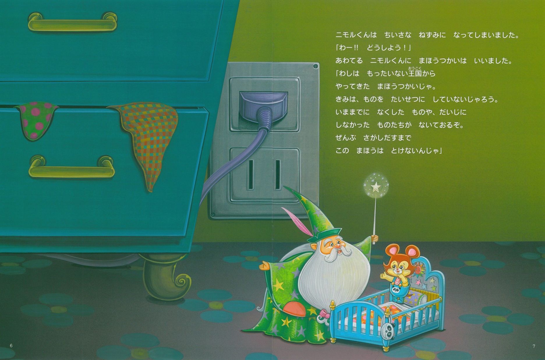 ニモルくんは、遊んでいたおもちゃや食べかけのおかしもすぐに飽きてしまいます。そんなある夜、もったいない王国の魔法使いが現われて、ニモルくんを小さなネズミにしてしまいました。その魔法を解くには、なくしたものや大事にしなかったものを、もったいない王国から取り戻さなくてはいけません。ニモルくんは、コンセントカバーの奥にある、もったいない王国へと出発しました。
