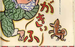 茶と栗と柿と麩を入れたザルを持ってさきちは町へ物売りに行きましたが、誰も買ってくれません。そこで売り声を上げることを思いつくのですが……。楽しい落語絵本です。