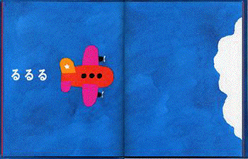 飛行機のエンジン音を「る」の音で表わし、大空のゆうゆうたる飛行から、思いがけない雲や飛行機群との遭遇をユーモアで描きます。