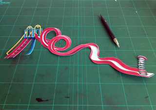 ぶらんこのくさりです。絵本の中のぶらんこは、くさりの輪っかをカラビナ(登山のときに使う道具)状に描いて、ぜんぶ1個1個切りぬいて、ピンセットつかって1個ずつのりで貼ってあるんです。