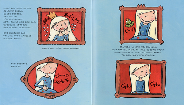 『ヒックゴロゴロはっくしょんひめ』。音からイメージされる通り、この絵本に出てくるお姫様は、恥ずかしくなるとくしゃみが出て、胸がドキドキするとお腹が鳴って、嬉しくなるとしゃっくりが止まらなくなり、悲しくなると鼻をぐすんぐすんとすする。4つの癖を持つ女の子なんです。
