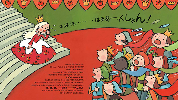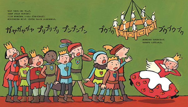 そのお腹の音のせいで、お姫様が王子様からブーイングを受ける場面。これも、原書では控えめなデザインだったのですが、「ページの端から端まで、ブーイングが響いているようにデザインしてください」とお願いしました。