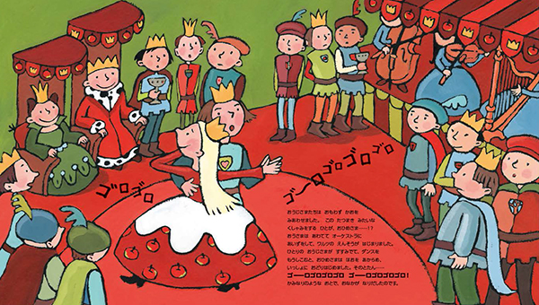 どのページもそうなのですが、ひとつはお姫様の結婚相手を選ぶ舞踏会で王子様と踊っている場面。胸がドキドキしているお姫様は「ゴロゴロ」とお腹が鳴ってしまうのですが、この「ゴロゴロ」という音は、ワルツを踊っているようにリズミカルに配置してもらうようにお願いしました。