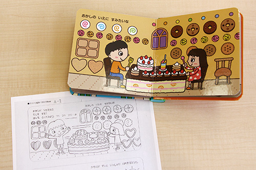 「おかしの いえに すみたいな」ラフと完成絵本(『フリフリえほん まほうが つかえたら』より)。