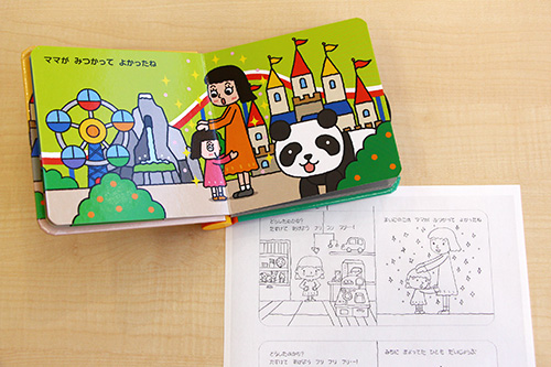 「ママがみつかってよかったね」ラフと完成絵本(『フリフリえほん まほうで たすけよう』より)。