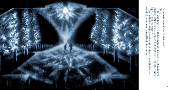 例えばカラーテレビよりもラジオの方が想像力を刺激することがあるように、情報量が多いことと豊かさとは必ずしもつながるわけではありませんよね。……なんていう理屈はいまだから言っているわけで(笑)、この絵本がモノトーンなのは、金井一郎さんの「銀河鉄道の夜」の絵と出会ってしまったからです。20年以上も前のことでした。そのときの衝撃は忘れられません。その絵は、まさに宇宙や銀河にちらばる星のように、光の粒そのものでできていたんですから。