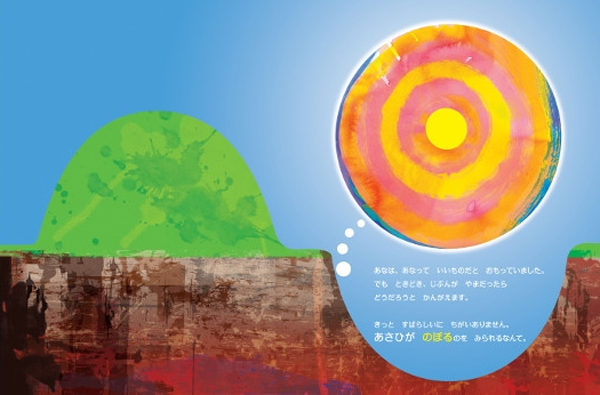 山は毎朝、美しい朝日がのぼるのを眺めます。穴は毎晩、地面の奥深くから響く地球の息づかいに耳を傾けます。自分は自分でいいけれど、一度でいいからあんなふうになってみたいな、どんなに素敵だろう?山と穴は相談して、モグラに手伝ってもらいます。シンプルで大胆なグラフィックと、やさしい言葉で紡がれるおはなし。小さな子どもたちから楽しめますが、大人の絵本の1冊としても味わい深い、奥行きのある作品です。