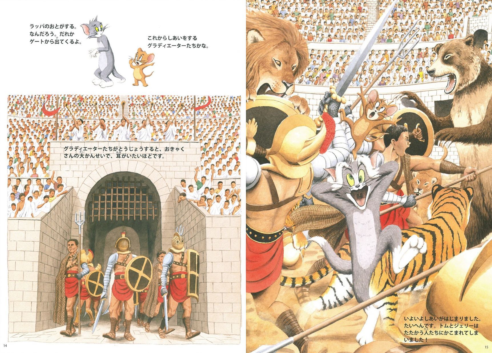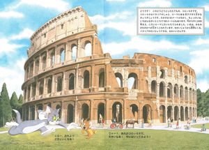 目が覚めたら古代ローマにいたトムとジェリー。怪しがられて兵士たちに追いかけられる2人を、ページをめくりながら追いかけるうちに、なんとコロッセオのなかをぐるっと案内してもらえちゃいます。