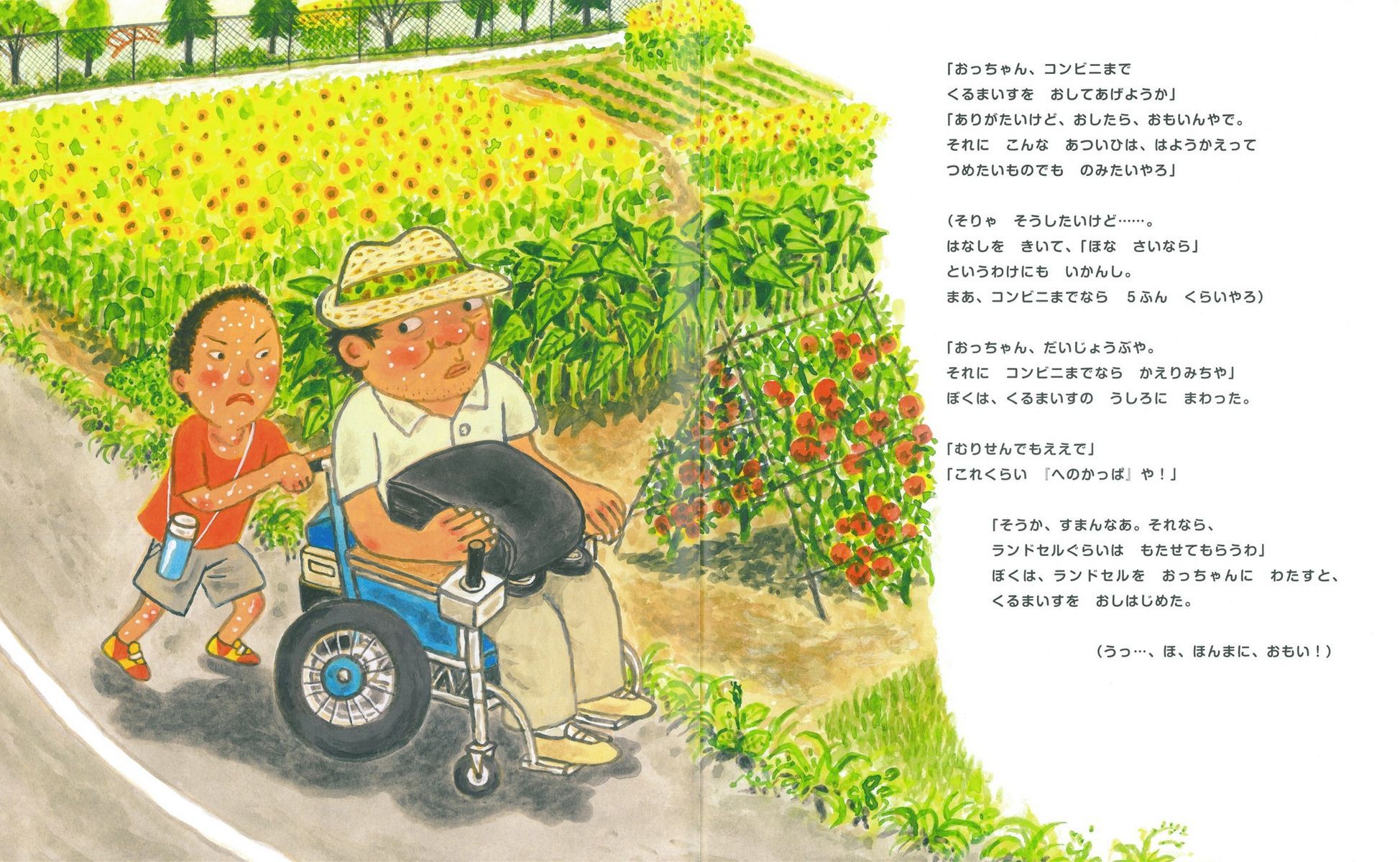 日ざしが照りつける、夏の帰り道。ぼくは、「くるまいす」に乗ったまま、動けなくなった男の人に会います。