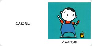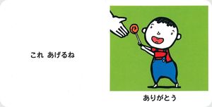 見開き展開で、一日の生活の中でかわされる、あいさつのことばを認識します。
