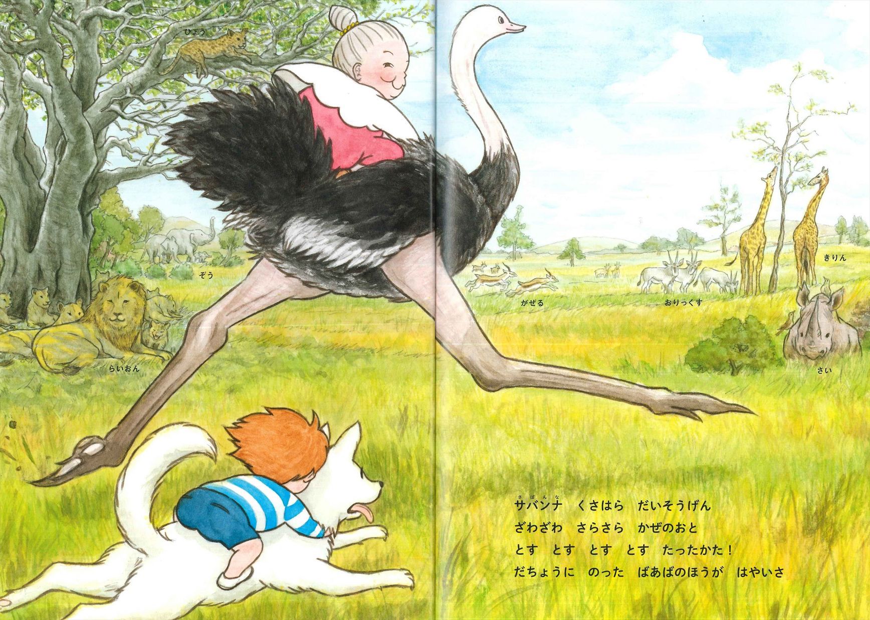 「ぼくと ばあばの きままな さんぽ。とっとこ こつこつ よっこらせ。ぼくのほうが あるくの はやいよ」と、ばあばの庭から始まった2人の競走。だんだんスピードアップして、どんどん前へ進んだら、なんとこんなところまできちゃったよ! 牧場、サバンナ、海底、ジャングル、大都会などなど、テンポよく世界がひろがっていき、最後はあっと驚く展開に。ページをめくるたびにまったく違う風景が広がるダイナミックさと、すみずみまで描きこまれた背景の緻密さが特長で、図鑑の入門書のようにも楽しめます。見返しには、動物や乗り物の速さをじっくり比べられるグラフもついていて、これまた必見です。