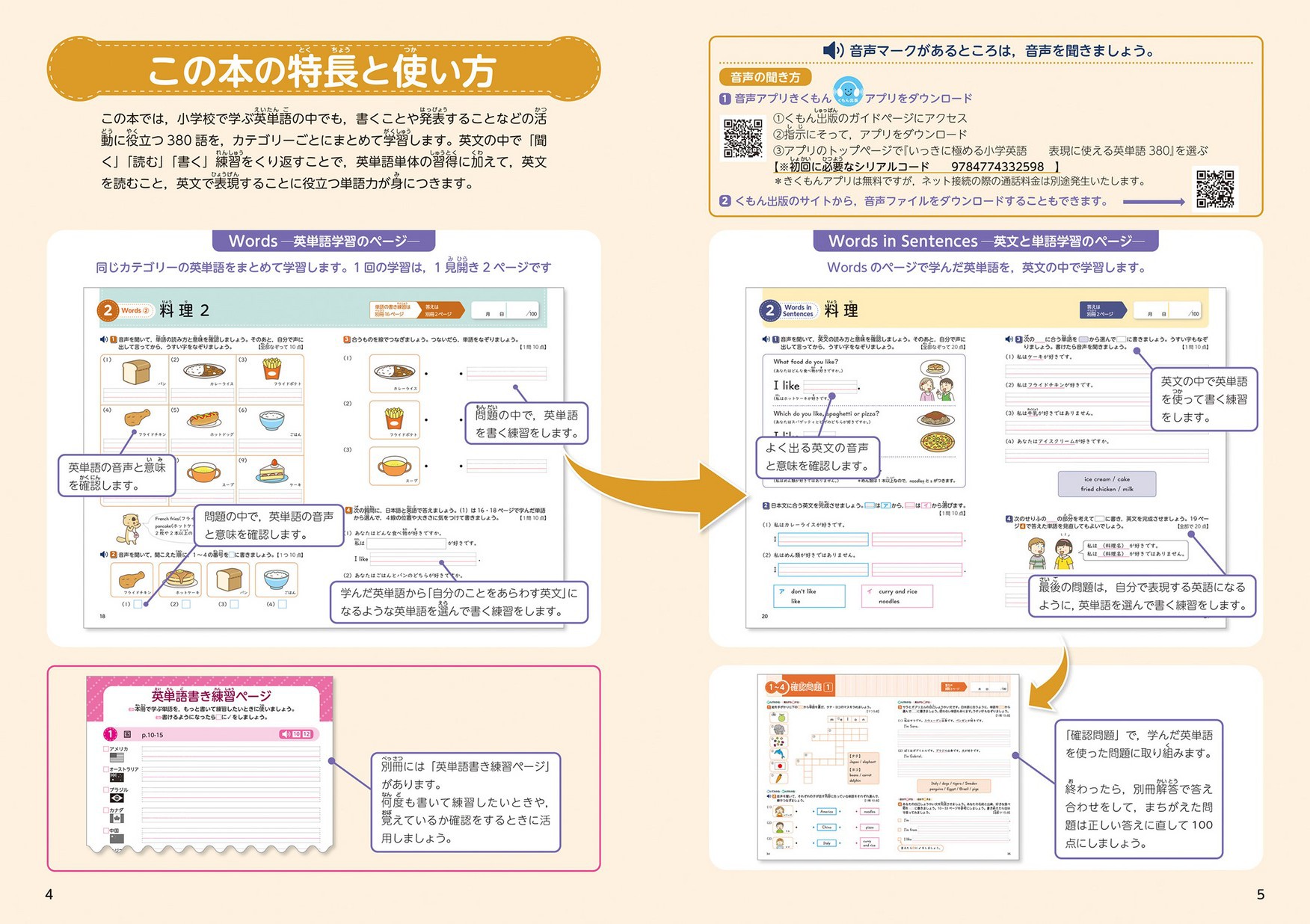 ・小学校英語の「書く」「発表」などの活動や、中学英語につながる、380の基本的な英単語を学びます。