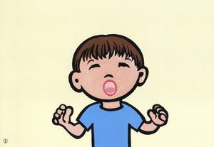 ファーファーファ〜ン。おじいちゃんのあくびはおおきいね。ぼくのあくびは、ちいさいよ。 くしゃみ、おなら、それからなきごえ……。家族の中で、だれのがおおきいかな?
