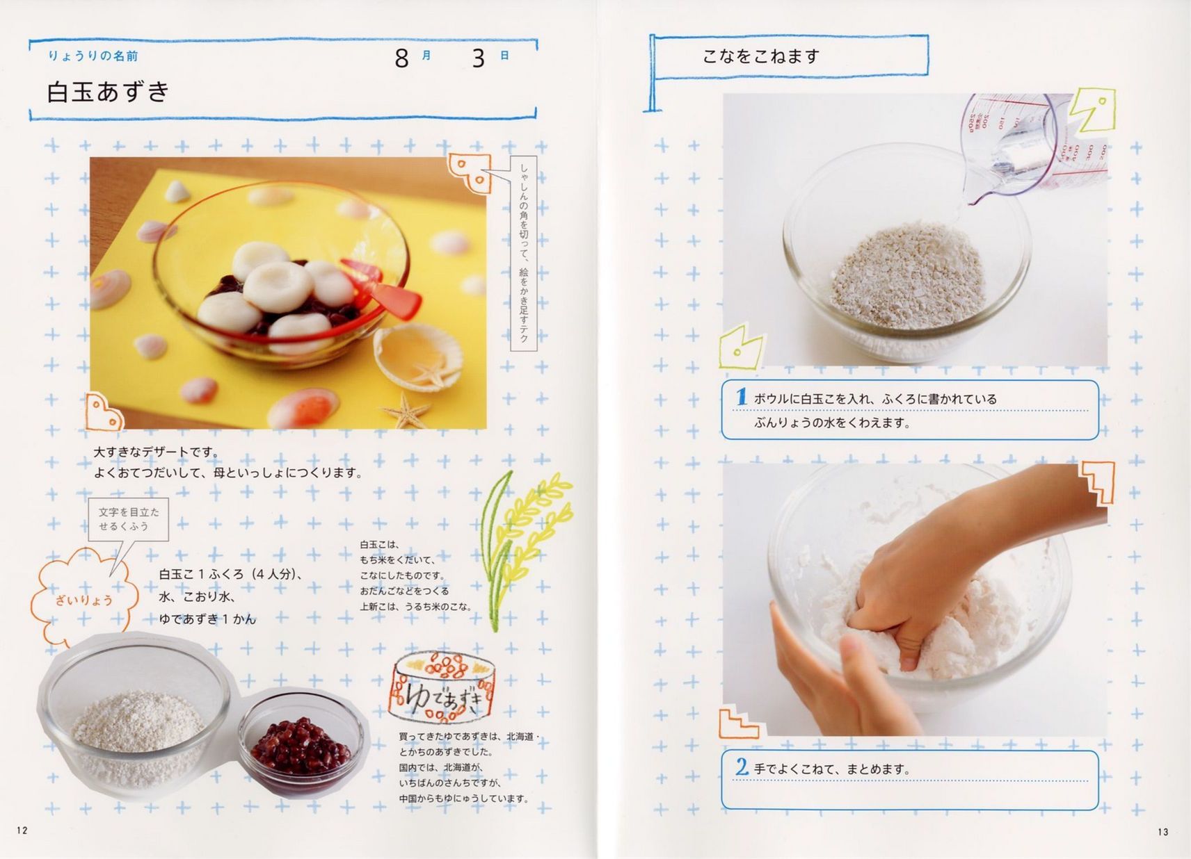 おにぎり、白玉あずき、ぎょうざ、フレンチトースト、紹介されている料理は4種類。ちょっと少なく感じるかもしれませんが、料理初めての子どもでも挑戦しやすいよう、作り方は大きな写真とシンプルな言葉で説明されています。同じ材料を使った応用編や、材料や道具の豆知識が載っているのもうれしい!