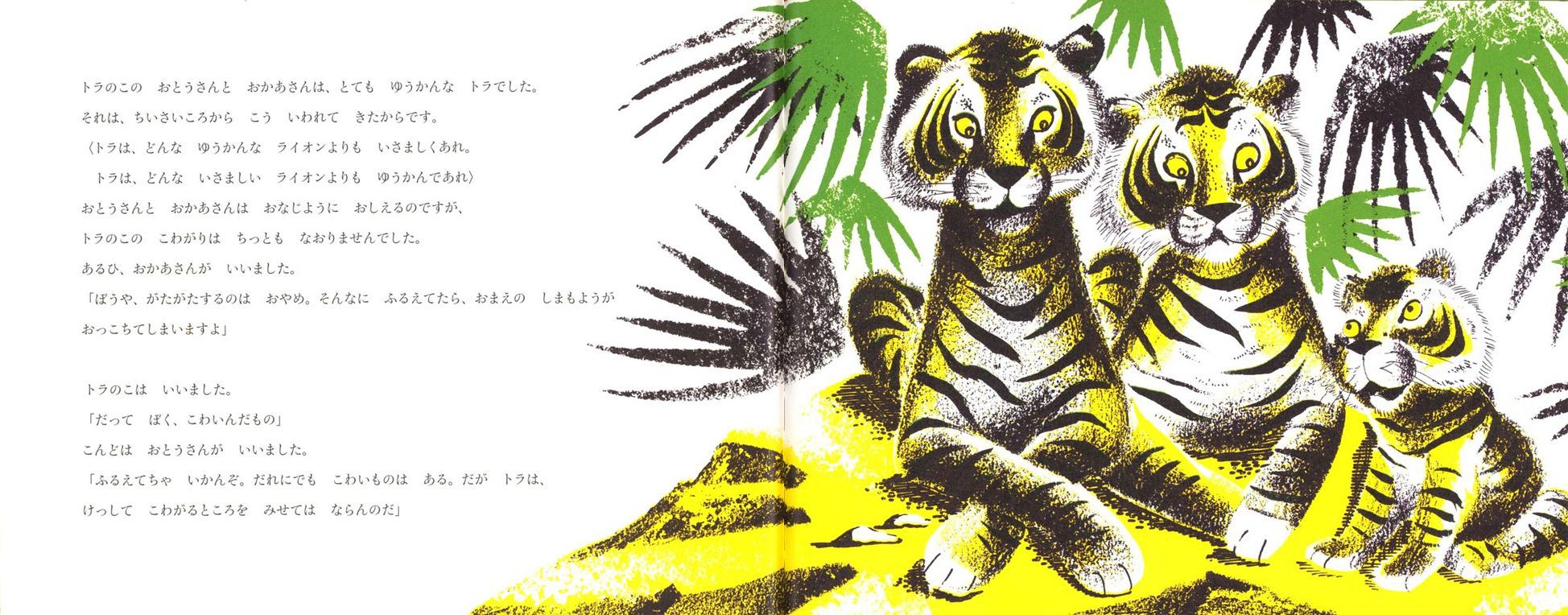 昔、ジャングルにとても怖がりなトラの子が住んでいました。トラの子は、とにかく一日中ふるえていました。心配したトラの子のお父さんとお母さんは、他の動物達が何を怖がるか、一緒に見てまわろうと誘います。トラの子の成長を描いたあたたかい物語。
