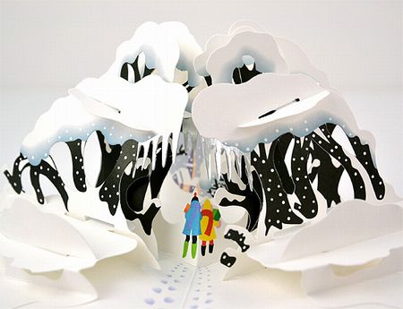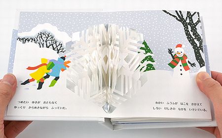 ページを開けば、精巧なつくりの銀色に輝く美しい雪の結晶やクリスマスカラーのマフラーをした愉快な雪だるまが立体的に飛び出します。白い雪をこんもりとかぶった森の木々が覆いかぶさるようにしてできた奥行きのあるトンネルには入り口にギザギザとしたつららのカーテンが現れます。夫婦が歩く道すがらの雪景色が次々と美しいしかけとなり、手のひらの中で物語を繰り広げる様子は、目の前の情景をよりドラマチックに演出してくれます。