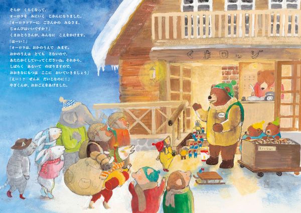 今度の目的は、なんと「オーロラ」。着いた場所は「ゆきまち」駅。見渡す限り一面の雪景色。まずはくまロッジに行ってツアーの受け付けです。出発までの空き時間、3人は雪遊びを満喫。空が暗くなると、いよいよオーロラを見に行く時間です。おやおや、やぎくん。相変わらずの大荷物、そんなに持って大丈夫? はりねずみくんも、やっぱり大はりきりで先頭を急ぎます。