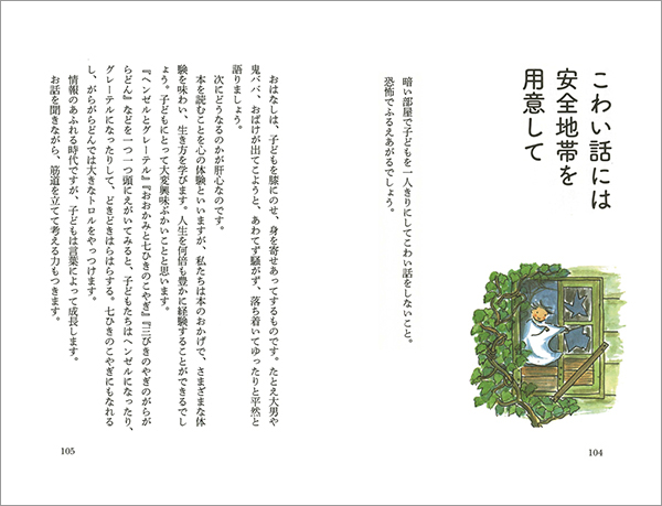 「大男や鬼ババ、おばけが出てこようと、あわてず騒がず、落ち着いてゆったりと平然と語りましょう。」ね。こわいはなしでよく読んだのはグリム童話。なかなか先生のいうことを聞かないワガママな子が聞いていると、その子の悪さをおはなしの中に盛り込んで、めいっぱいこわくしておどかしたこともあったわ(笑)。もちろん、信頼関係がしっかりとできている子じゃないとダメよ。子どもたちは「キャ!」っていったり「わっ!」って言ったり、こわがりごっこをするんだけど、読み終わると「なんだ、ちっともこわくないや。先生、次はもっとこわいはなしを読んで」って言うの。でも、最後はちゃんと、『ちいさなねこ』や『だるまちゃんとてんぐちゃん』でお口直しをするのが大事なの。