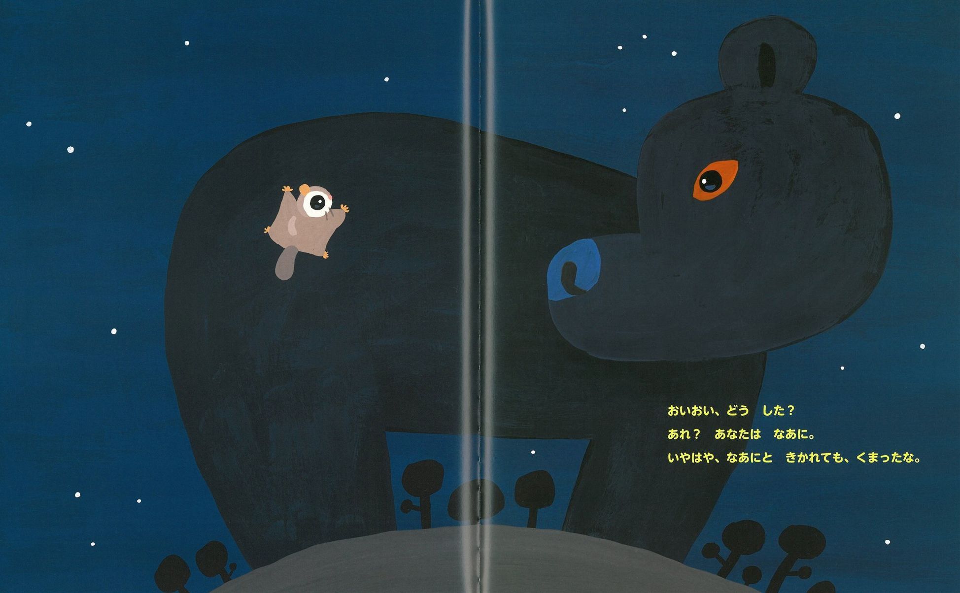「バンッ!!」 真っ暗な空で、もんじろうは何かにぶつかった? 「・・・よるって、かたい。」 はてさて、もんじろうはどこに着地したのでしょう。 こうして、もんじろうのドキドキの冒険飛行が始まります。