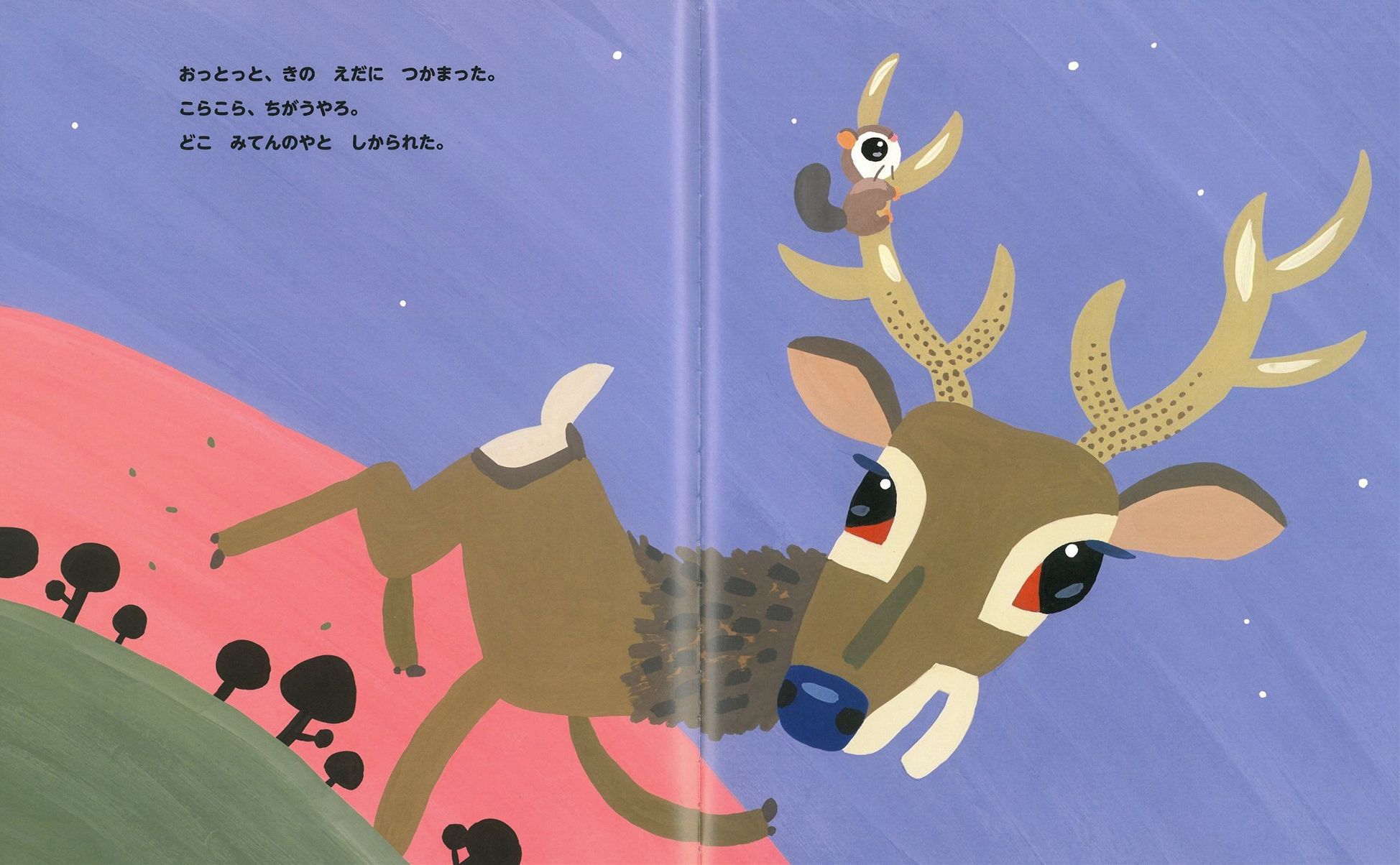 もんじろうは、ひとりぼっちのモモンガ。 まだ空を飛んだことがありません。 木の枝の先、とびたいけれど、ドキドキ、ドキドキ。 でも、ふいに風がもんじろうを押したもんだから、 もんじろうは夜のやみに向かって飛んでしまいました。