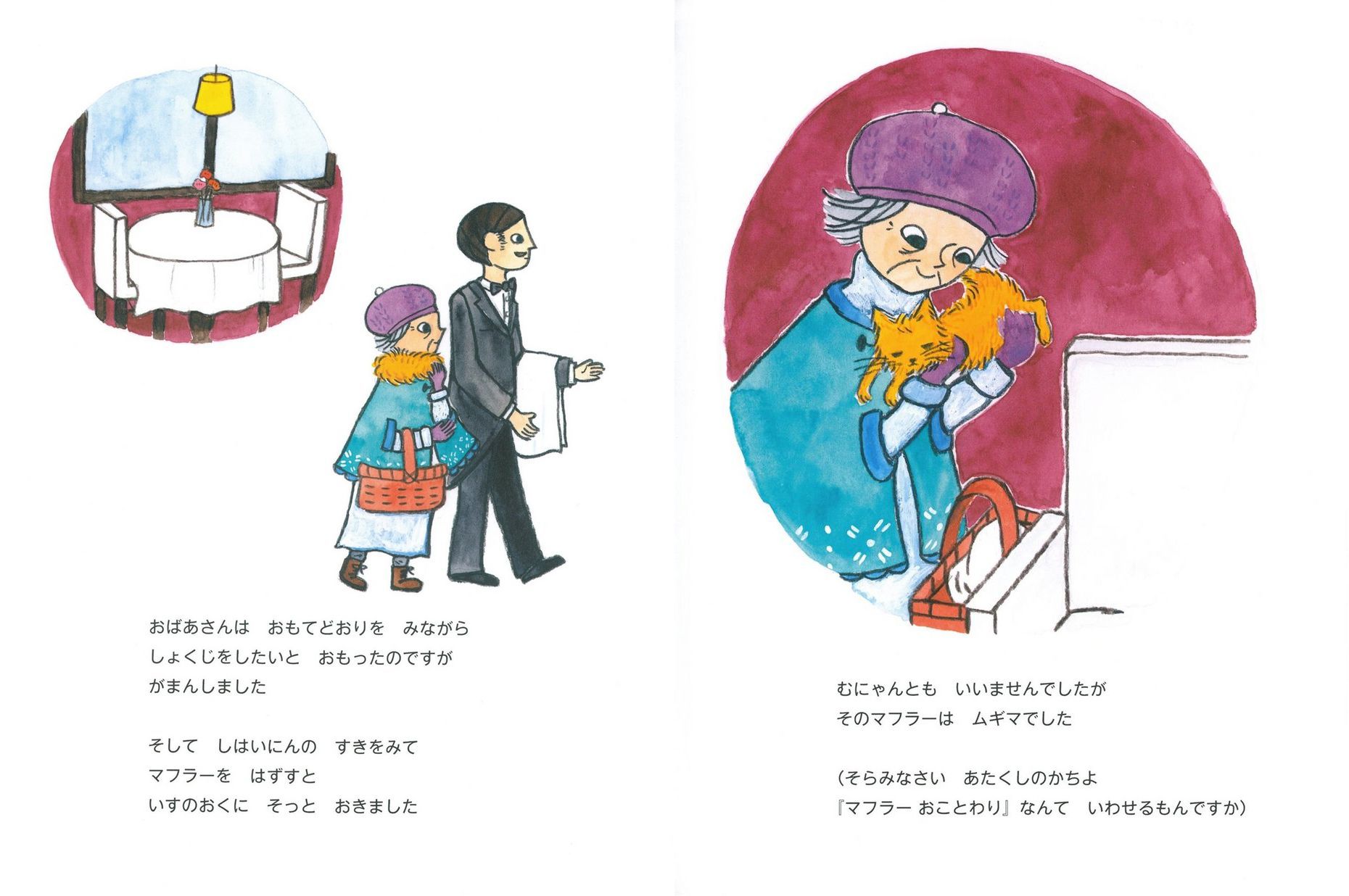 猫好きのおばあさんがなんとか一緒にレストランで食事したくて、いろいろ考えるのが面白いです。マフラーとして首に巻いてなんとか成功します。