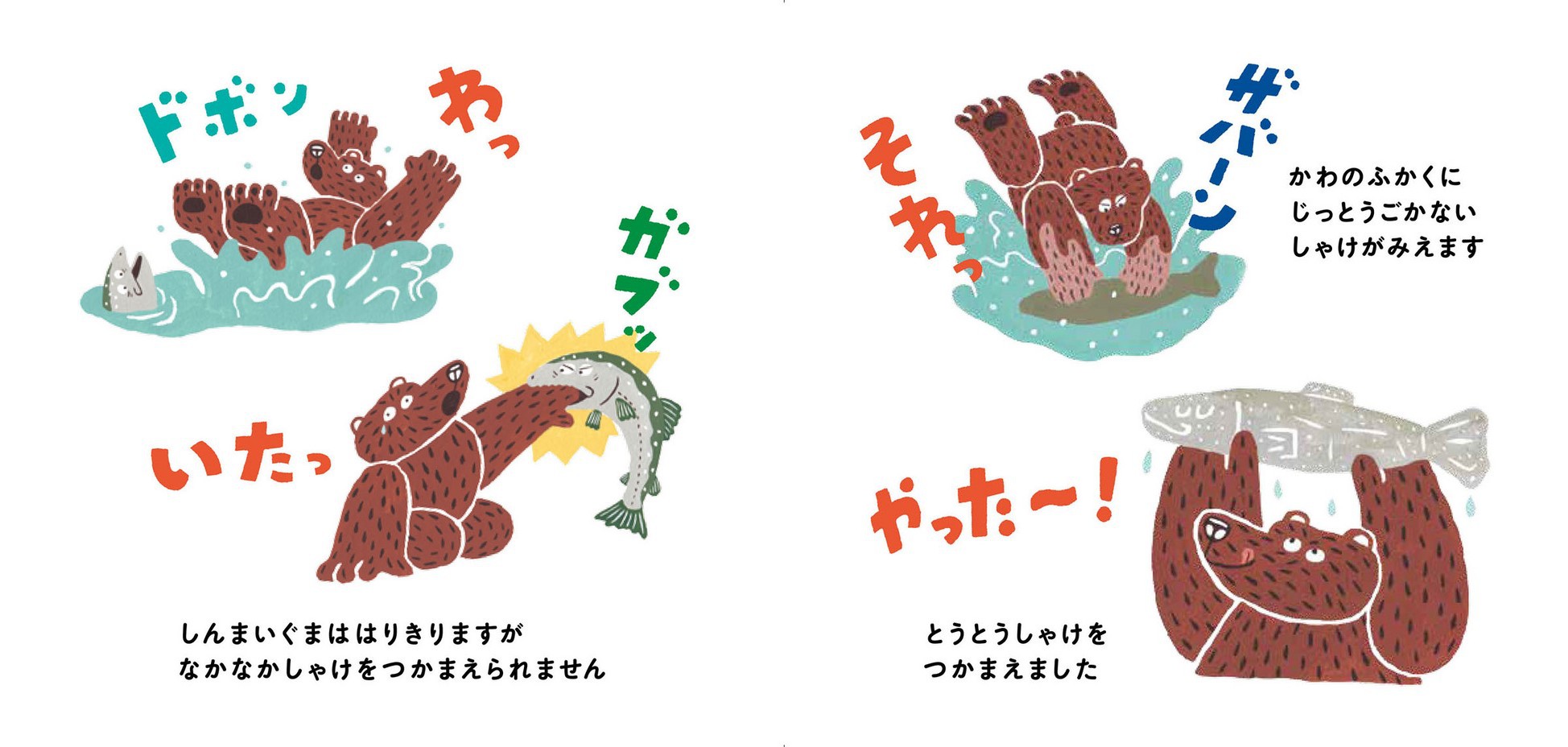 主人公はちょっととぼけた「新米の」くま。だいすきなしゃけをつかまえようと川へやってきますが、