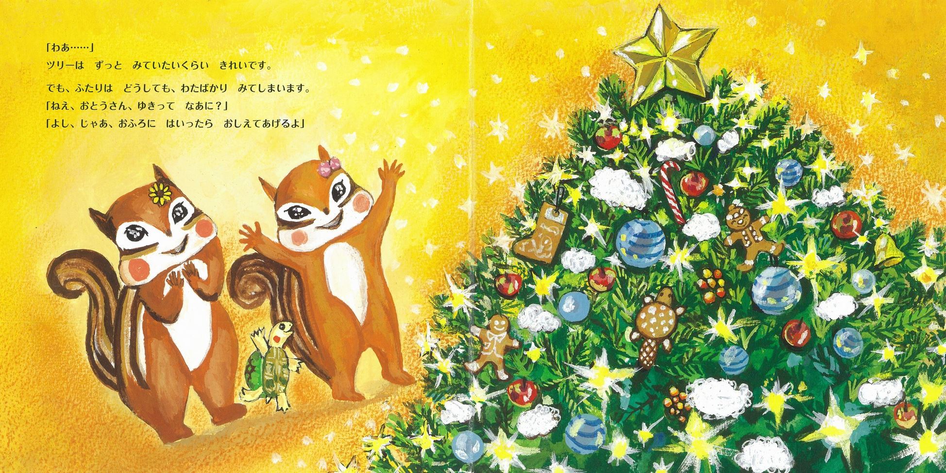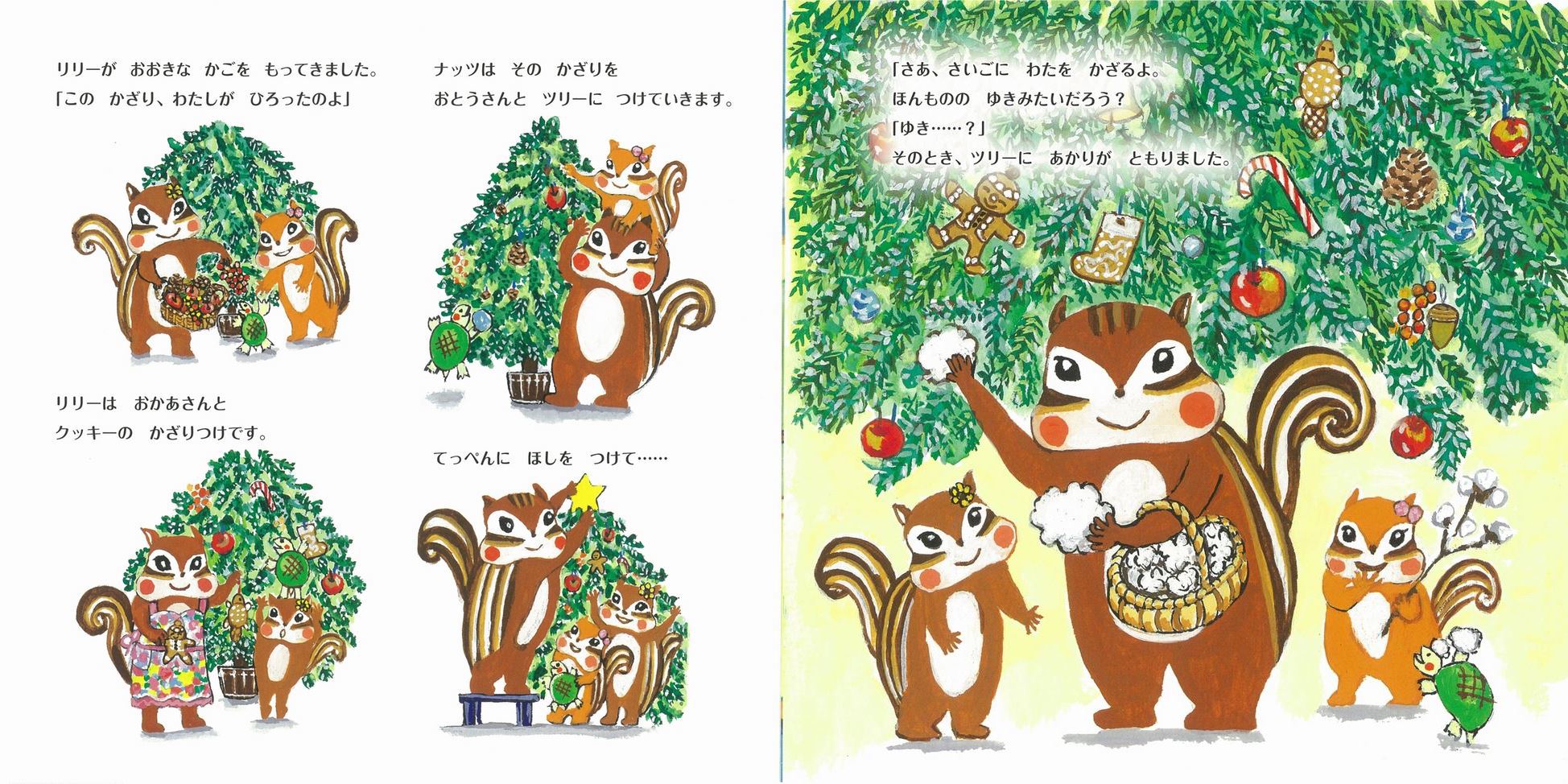 リリーとナッツのうちでも、家族みんなでツリーの準備が始まりましたよ。リリーが拾った木の実の飾りやクッキーを飾りつけ、てっぺんに星をつけたら、仕上げにお父さんが取り出したのは綿。