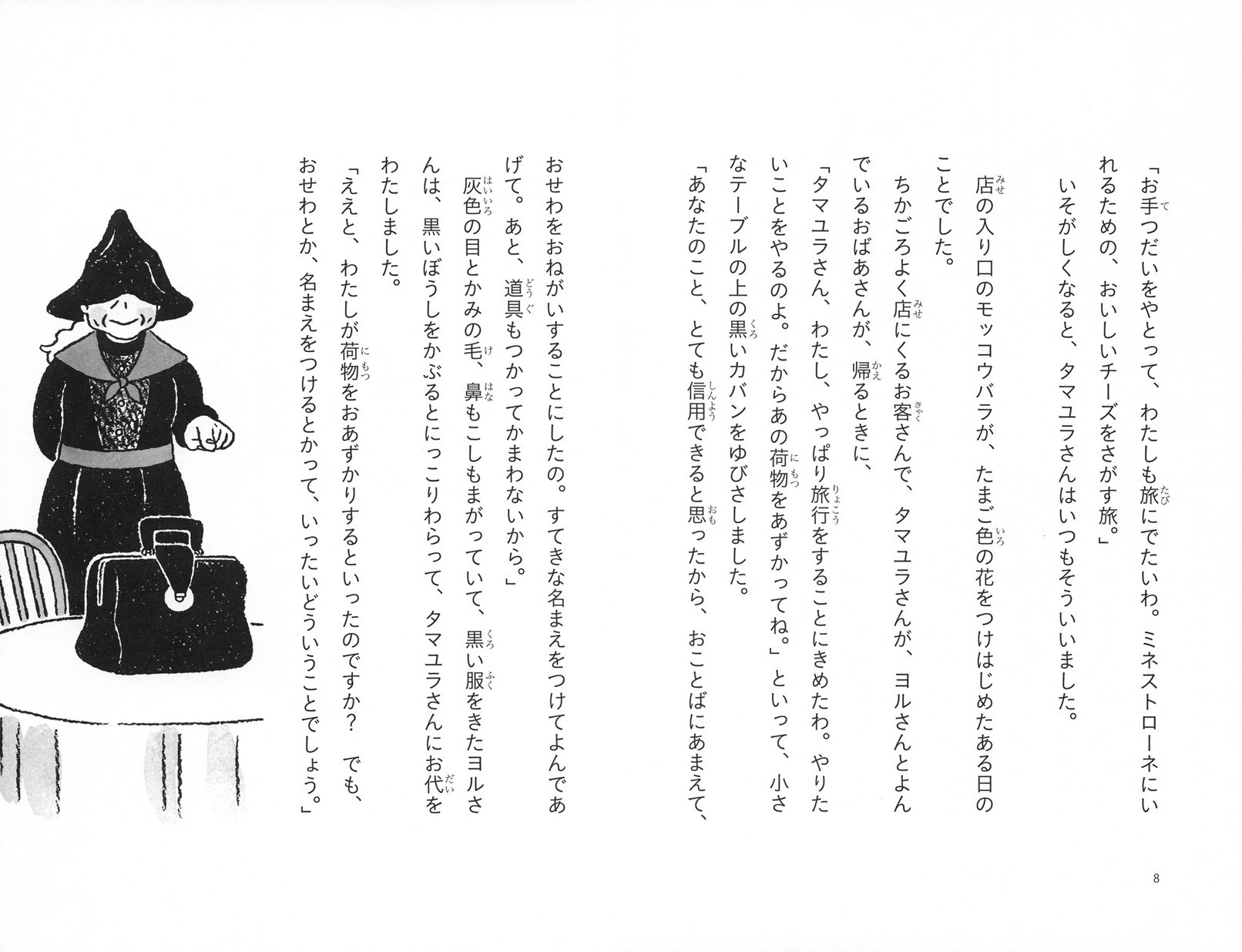 ある日、店主のタマユラさんは、お客のヨルさんというおばあさんから黒いカバンをあずかりました。おそるおそる開けてみると、はいっていたのは、なんと “魔女の持ちものセット”。 しかもタマユラさんは、気づかないうちに、魔女のふしぎな能力をみにつけていました。相手が動物でも植物でも道具でも、名前をつけただけで、たちまち話せるようになっていたのです!