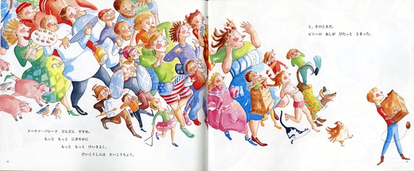 いちばん最初はドーナツひとつ。ビリーが腰にぶらさげたドーナツに、動物たちがついてくる。それを見て「おもしろそう」と子どもたち。そのうち大人もついてきて、町中をまきこみ大騒ぎ! マザーグースや伝説の主人公もまじってる。当のビリーはひとり騒ぎをぬけて、水辺へおりてゆく。船をうかべ、ドーナツをぱくり。レベッカ・ボンドの、明るく開放的でゆかいな絵本。