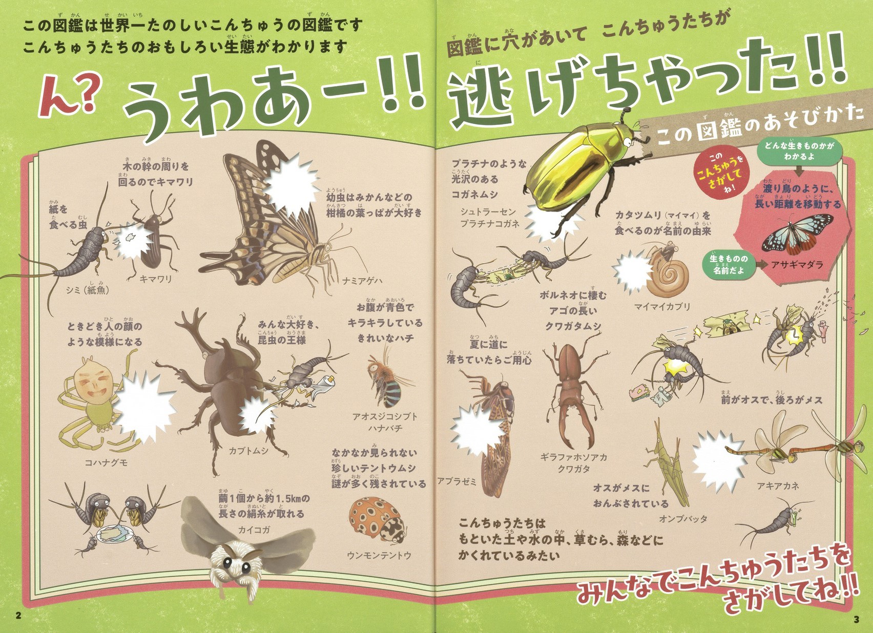 大変! 昆虫図鑑から、昆虫たちが逃げ出した!昆虫たちは、もといた土や水の中、草むらや森などに隠れているみたい。え? あんなところにも?!