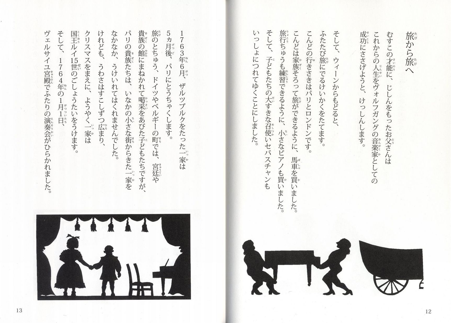 いまも、中世の街なみをうつくしくのこす街、 ザルツブルクはオーストリアの首都ウィーンから 西にとおくはなれた ドイツとの国境ちかくにあります。 1756年1月27日の夜、 このザルツブルクで、大司教さまにつかえる 宮廷音楽家レオポルトと妻アンナ・マリアに 男の子が生まれました。 その子の名まえは ヴォルフガング・アマデウス・モーツァルト。 やがて、この子が「神童」とうたわれ、 人びとをおどろかせるとは、……【本文より抜粋】